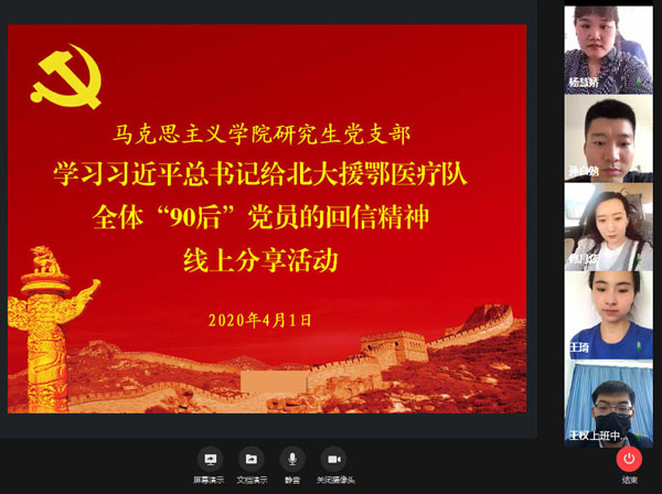 本网讯(通讯员杨慧娇)“在新冠肺炎疫情防控斗争中,你们青年人同在一线英勇奋战的广大疫情防控人员一道,不畏艰险、冲锋在前、舍生忘死,彰显了青春的蓬勃力量,交出了合格答卷。”3月15日,习近平总书记给北京大学援鄂医疗队全体“90后”党员回信,谆谆嘱托不仅鼓舞着援鄂医疗队的青年党员,同样也激励着英国上市365官网研究生党员,研究生党支部第一时间开展了学习习近平总书记回信精神线上交流分享活动。