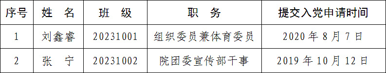 按照发展党员工作有关规定,根据党员推荐和群团组织推优情况,经研究生支部委员会研究,并报学院党委备案,确定刘鑫睿、张宁2名同学为入党积极分子。