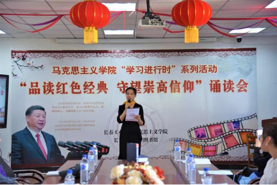 我院师生的深情朗读感染了现场每一位倾听者,从《共产党宣言》、《资本论》、《为人民服务》、《马克思主义的三个来源和三个组成部分》到《社会革命的秘密:工人阶级的解放》、《青年在选择职业时的考虑》、《人的正确思想是从哪里来的》、《解放思想实事求是团结一致向前看》到最后的《实现中华民族伟大复兴是中华民族近代以来最伟大的梦想》。诵读者们生情并茂、抑扬顿挫的吟诵赢得了在场观众们的热烈掌声,现场气氛十分活跃。